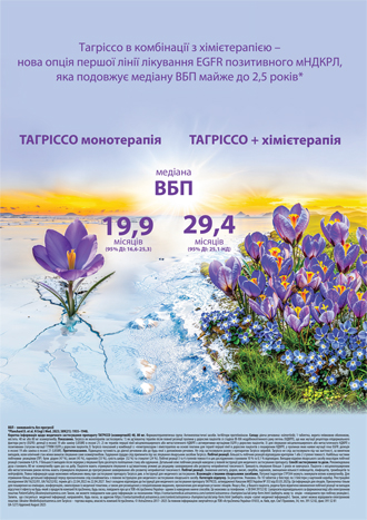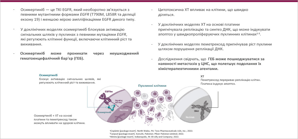 Які ж основні фактори, що впливають на прогноз у пацієнтів з EGFRm НДКРЛ та необхідність інтенсифікації терапії? Це наявність метастазів у центральній нервовій системі (ЦНС), мутація L858R у 21-му екзоні, а також високе пухлинне навантаження. Відомо, що ураження ЦНС знижує загальну виживаність (ЗВ) з 16,0 до 11,9 міс, а мутація L858R знижує виживаність без прогресування (ВБП) з 21,4 до 14,4 міс. У підсумку ці несприятливі фактори потребують посилення терапії для пацієнтів з EGFRm НДКРЛ. Результати дослідження FLAURA та FLAURA2, надані автором, дозволяють оцінити ефективність та безпеку препарату осимертиніб у пацієнтів з поширеним НДКРЛ з EGFRm, зважаючи на відмінності у їхньому дизайні. Зокрема, дослідження FLAURA — це рандомізоване подвійне сліпе дослідження III фази, що порівнює застосування осимертинібу зі стандартною терапією інгібіторами тирозинкінази рецептора епідермального фактора росту (EGFR TKI) (гефітиніб або ерлотиніб), FLAURA2 — рандомізоване відкрите дослідження III фази, що порівнює осимертиніб поєднано з ХТ (платина + пеметрексед) з монотерапією осимертинібом. Первинні кінцеві точки для FLAURA — ВБП, для FLAURA2 — ВБП та ВБП у пацієнтів з метастазами в ЦНС. Вторинні кінцеві точки для обох досліджень включають ЗВ, частоту об’єктивної відповіді та тривалість відповіді. Дослідження FLAURA2 охоплювало пацієнтів з більш несприятливим прогнозом, про що свідчать наступні відмінності порівняно з FLAURA: метастази в головний мозок у FLAURA2 визначалися на етапі залучення у всіх хворих, тоді як у FLAURA — не у всіх. У FLAURA2 40–42% пацієнтів мали метастази в головний мозок, тоді як у FLAURA — 19–23%. Пацієнти FLAURA2 характеризувалися вищим пухлинним навантаженням (середній розмір пухлини становив 64–65 мм) порівняно з FLAURA (55–57 мм). У FLAURA2 53–54% пацієнтів мали екстраторакальні метастази, тоді як у FLAURA — 34–37% осіб. Відомо, що комбінація EGFR TKI з ХТ (поліхімієтерапією (ПХТ)) працює ефективніше, оскільки вона долає резистентність пухлинних клітин до EGFR TKI та забезпечує повнішу елімінацію пухлини. У деяких пацієнтів пухлинні клітини можуть розвивати резистентність до лікування EGFR TKI, що призводить до прогресування хвороби, тоді як ХТ, додана до EGFR TKI, дозволяє знищити ті з них, які стали стійкими до EGFR TKI. Комплексний вплив такої терапії полягає в тому, що EGFR TKI впливають на одну популяцію пухлинних клітин, тоді як ХТ впливає на резистентні клони, що дозволяє досягти стійкої відповіді та елімінації персистивних пухлинних клітин (рис. 1). Така комбінація покращує загальні клінічні результати лікування, які відмічаються при застосуванні лише EGFR TKI. Тож комбінація осимертинібу з ХТ діє синергічно, затримуючи розвиток резистентності та підвищуючи рівень відповіді порівняно з монотерапією осимертинібом. Окрім того, не всі пацієнти, що приймали осимертиніб, можуть отримати ХТ після прогресування патології, тому її комбінація з осимертинібом у 1-й лінії забезпечує більш ефективне лікування. ![]() Рис. 1. Застосування осимертинібу в комплексі з хімієтерапією. Довідкова інформація