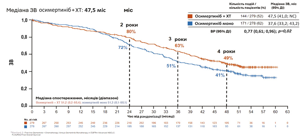 Представлені автором дані Настанови NCCN (версія 7.2024) вказують на сучасні можливості лікування НДКРЛ, зокрема у пацієнтів з мутаціями або делеціями в генах EGFR. Наведено схему, що деталізує терапію першої лінії для хворих з делецією в 19-му екзоні або мутацією 21-го екзону гена EGFR. Рекомендовані варіанти терапії включають осимертиніб як переважний варіант, а також інші варіанти, такі як ерлотиніб, афатиніб, гефітиніб, дакомітиніб, рамуцирумаб та бевацизумаб. У разі прогресування захворювання після першої лінії терапії рекомендована подальша системна терапія з можливими варіантами, що включають ХТ або інші цільові препарати. Окремо визначені варіанти з підтримуючою терапією, перервами або заміною схеми лікування. Тож, відповідно до рекомендацій NCCN, пацієнту призначено паліативну ПХТ за схемою пеметрексед + карбоплатин, проведено 1 курс лікування, після чого виявлено EGFRm (19-й екзон) за результатами молекулярного тестування. Додано препарат осимертиніб (80 мг) щоденно до основної схеми лікування і проведено ще 4 курси терапії в комбінованому режимі, оскільки осимертиніб у комбінації з ХТ може діяти синергічно, уповільнюючи розвиток резистентності. Автор представив результати лікування, які включають регрес основного вогнища на 42%, повний регрес метастатичного вогнища в нижній частці легені, нормалізацію лімфовузлів середостіння. Відоме дослідження FLAURA2 — це відкрите рандомізоване дослідження III фази, яке оцінює застосування осимертинібу з ХТ (препаратами платини та пеметрекседом) або без неї як терапії першої лінії при НДКРЛ. У межах дослідження пацієнти з місцево-поширеним або метастатичним НДКРЛ з EGFRm (Ex19del, L858R), які не отримували попередньої системної терапії, пройшли лікування комбінацією осимертиніб з ХТ (препарат платини та пеметрексед), що значно поліпшило відповідь пухлини. Зокрема, частота загальної відповіді для комбінованої терапії становила 83% (95% довірчий інтервал (ДІ) 78–87), тоді як для монотерапії осимертинібом — 76% (95% ДІ 70–80). Медіана тривалості відповіді (95% ДІ) для комбінованої терапії становила 24,0 міс (20,5–27,8), а для монотерапії — 15,3 міс (12,7–18,4). Комбінація осимертинібу з ХТ (препарати платини та пеметрексед) значно подовжила ВБП у пацієнтів з НДКРЛ та EGFRm порівняно з монотерапією осимертинібом. Середня ВБП для комбінованої терапії становила 29,4 міс, тоді як для монотерапії осимертинібом — 19,9 міс. Через 24 міс показники ВБП були вищими у групі, яка отримувала комбіновану терапію. У підсумку комбінація осимертинібу з ПХТ (препарати платини та пеметрексед) значно подовжила ВБП у хворих з EGFRm раком легень незалежно від типу мутації (Ex19del або L858R) порівняно з монотерапією осимертинібом. Так, дослідження підтверджує ефективність комбінованої терапії осимертинібом та ПХТ як нової опції лікування для пацієнтів з EGFRm раком легень. Результати аналізу 4-річної ЗВ також свідчать на користь комбінованого лікування осимертинібом з платиною та пеметрекседом (ПХТ) порівняно з монотерапією осимертинібом. Так, медіана ЗВ у групі комбінованого лікування була вищою (47,5 міс) порівняно з монотерапією (37,6 міс) (рис. 2). ![]() Рис. 2. FLAURA2. Дані ЗВ* Примітка: NC (Not Calculable) — не обчислюється. Це часто трапляється, коли більше ніж половина пацієнтів ще живі на момент кінцевого спостереження. Важливим аспектом терапії є профіль безпеки та переносимі