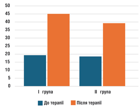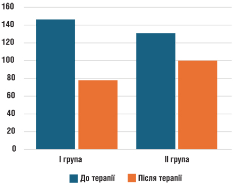 ![]() Рис. 2. Зміни показників IL-8 у пухлинній тканині у I та II групах до початку та після проведеної терапії