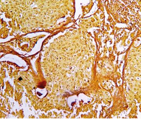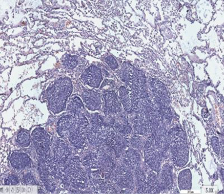 ![]() Рис. 6. Плоскоклітинний рак. Проростання раковими клітинами мембрани альвеоли і подальший солідний ріст. Howell, Black. Збільшення ×600