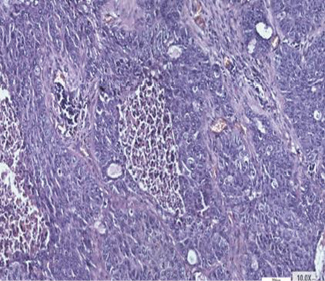![]() Рис. 4. Залозистий рак. Ріст в альвеолах з некрозом у центрі. Гематоксилін і еозин. Збільшення ×200