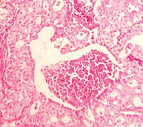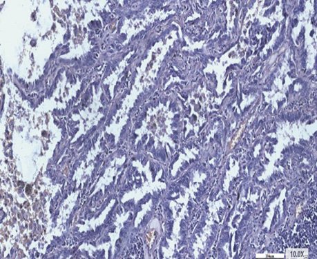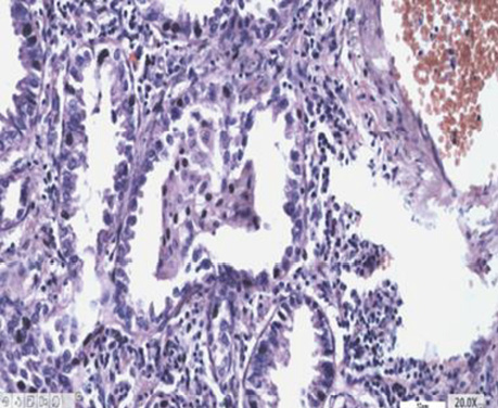 У гістологічній структурі залозистого раку виявлялися солідні ділянки росту аденокарциноми з ознаками різного ступеня диференціювання. Ідентифікувалися ділянки БАРЛ, де можна було фіксувати його ріст в альвеолах. Прослідковувалися великі альвеоли з чітко визначеним ростом РЛ в них, які заповнювали всю альвеолу з некрозом у центрі (рис. 3–6). ![]() Рис. 3. Залозистий рак. Ріст у множинних альвеолах. Гематоксилін і еозин. Збільшення ×200