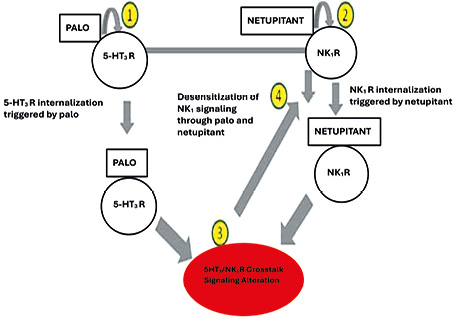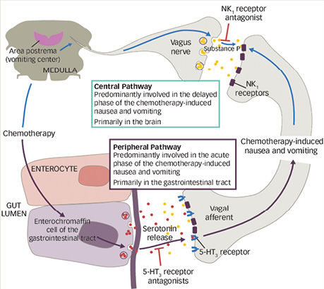 Modern opportunities for the prevention of chemotherapy-induced nausea and vomiting: the role of the fixed combination netupitant + palonosetronDunaieva I.P., Kryvoshapka O.V., Doroshenko O.M., Shapoval O.M., Pautina O.I. Summary. The article summarises current views on the pathogenesis of chemotherapy-induced nausea and vomiting (CINV) and substantiates the expediency of using combined antiemetic strategies in patients receiving moderately and highly emetogenic chemotherapy. The roles of peripheral and central mechanisms in the formation of the emetic reflex, involving serotonin 5-HT₃ and neurokinin-1 (NK1) receptors, are considered, underscoring the need for a multicomponent, pathogenetically targeted approach to CINV prophylaxis. Particular attention is paid to the fixed combination of netupitant and palonosetron (NEPA) as a modern means of antiemetic prophylaxis. The pharmacological and pharmacokinetic properties of NEPA components, their synergistic interactions, and their clinical advantages, in particular, effective control of both acute and delayed phases of CINV, are analysed. Data from randomised clinical studies and meta-analyses are presented that confirm NEPA’s high clinical efficacy, safety, and convenience compared with traditional aprepitant-containing regimens. The place of the fixed combination netupitant + palonosetron in current international clinical recommendations from Multinational Association of Supportive Care in Cancer / European Society for Medical Oncology (MASCC / ESMO) and American Society of Clinical Oncology (ASCO) as one of the agents of choice for CINV prophylaxis is shown, which contributes to increased patient adherence to treatment and to the optimisation of supportive therapy in oncology practice. Received 22.01.2026 DOI: 10.32471/clinicaloncology.2663-466X.35373 INTRODUCTIONCINV are among the most common and, at the same time, the most burdensome complications of modern anticancer treatment. According to clinical observations and multicenter studies, the incidence of CINV ranges from 30 to 90% and depends on the emetogenic potential of the chemotherapy regimen, the drug dose, the route of administration, and individual patient characteristics. It should be noted that pronounced emetogenic potential is typical of older cytotoxic agents, including platinum compounds. In contrast, modern agents such as monoclonal antibodies are characterised by moderate or even low emetogenicity. Nevertheless, despite significant progress in the development and implementation of antiemetic therapies, the problem of effective control of nausea and vomiting remains relevant in everyday oncology practice [1–6]. The clinical significance of CINV goes far beyond mere symptomatic discomfort. Persistent or uncontrolled nausea and vomiting substantially reduce patients’ quality of life, disrupt nutrition and water–electrolyte balance, and contribute to the development of asthenic syndrome, dehydration, and metabolic disorders. In a number of cases, severe manifestations of CINV become a reason for reducing chemotherapy drug doses, postponing subsequent courses, or even complete refusal to continue anticancer therapy, which directly and negatively affects treatment efficacy and oncological prognosis [2, 5–6]. A particular clinical problem is the delayed phase of CINV, which develops 24–120 hours after chemotherapy administration and is often less controllable compared with the acute phase. It is delayed nausea that is most often perceived by patients as the most exhausting, responds poorly to standard antiemetic regimens, and significantly reduces adherence to treatment. At the same time, clinical studies indicate that insufficient control of the acute phase of CINV substantially increases the risk of delayed symptoms in the subsequent days [2, 6]. Current views on the pathogenesis of CINV are based on an understanding of the complex interactions between peripheral and central mechanisms, in particular the roles of serotonin 5-HT3 receptors and the NK1 receptor for substance P. This determines the need for a multicomponent approach to CINV prevention, with simultaneous impact on different links in the emetic reflex pathway. In this context, combined antiemetic regimens combining 5-HT3 and NK1 receptor antagonists with corticosteroids are considered the most pathogenetically substantiated. The development of CINV involves interconnected peripheral and central signalling pathways that engage serotonin 5-HT3 and NK1 receptors (Fig. 1) [2, 6–7]. ![]() Fig. 1. Peripheral and central mechanisms of the development of chemotherapy-induced nausea and vomiting. The peripheral pathway is realised through the release of serotonin from enterochromaffin cells of the gastrointestinal tract, with activation of 5-HT3 receptors of afferent fibres of the vagus nerve and predominantly determines the acute phase of symptoms. The central pathway is associated with activation of NK1 receptors of substance P in brainstem structures, including the area postrema, and plays a leading role in the development of the delayed phase of nausea and vomiting. 5-HT3 and NK1 receptor antagonists block the respective links of pathogenesis [6] Given the increasing use of highly and moderately emetogenic chemotherapy regimens, as well as the increasing duration and intensity of oncological treatment, the search for optimal, effective, and patient-convenient antiemetic strategies is a highly relevant task of modern oncology. Fixed combinations of antiemetic drugs are of particular interest in this regard, as they enable greater efficacy of CINV prophylaxis, simplify the treatment regimen, and improve patients’ adherence to therapy [8–10]. Considering the multifactorial pathogenesis of CINV, effective prophylaxis of this complication requires simultaneous effects on both peripheral and central mechanisms of formation of the emetic reflex. Current clinical recommendations from leading international 